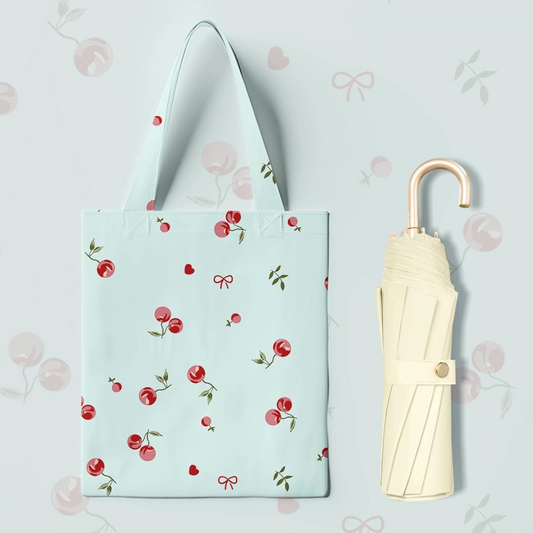 甘い小さなさくらんぼと花(大きめの収納袋付き)の3段折りたたみ傘(晴雨兼用傘)8本骨