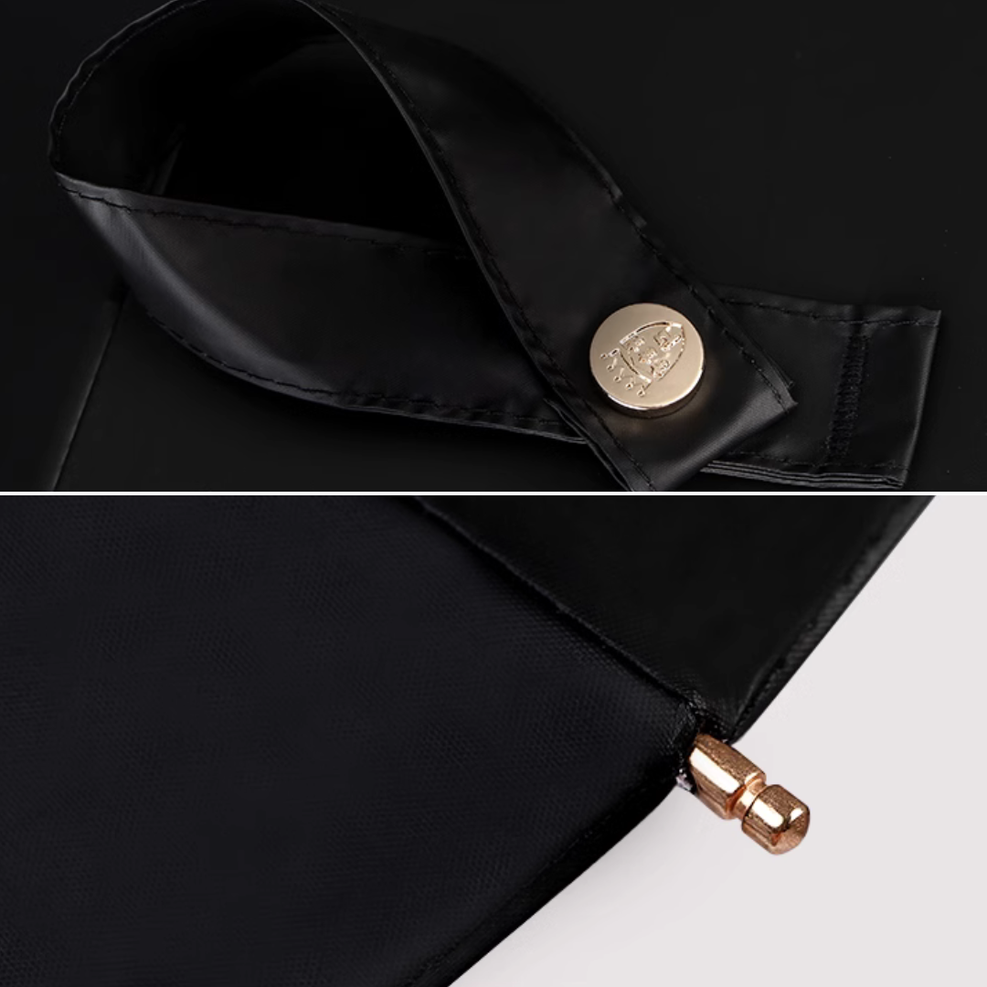 生地は日差しを遮る3つの遮光層(UVA遮断層、UVB遮断層、可視光線遮断層)と外側の防水層からなります。紫外線(UVA, UVB)、可視光線、赤外線(IR)を防いでくれます。また、高密度な外側の布には撥水性がもありますので、内側の遮光層が雨によって悪くなる心配はありません。