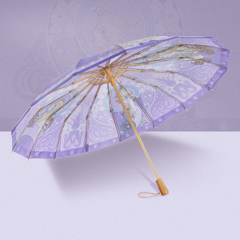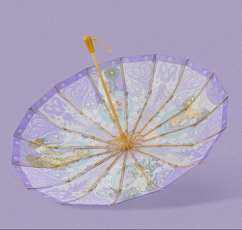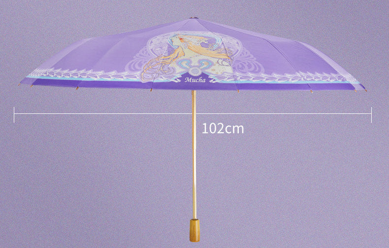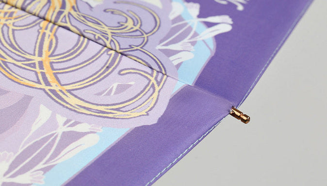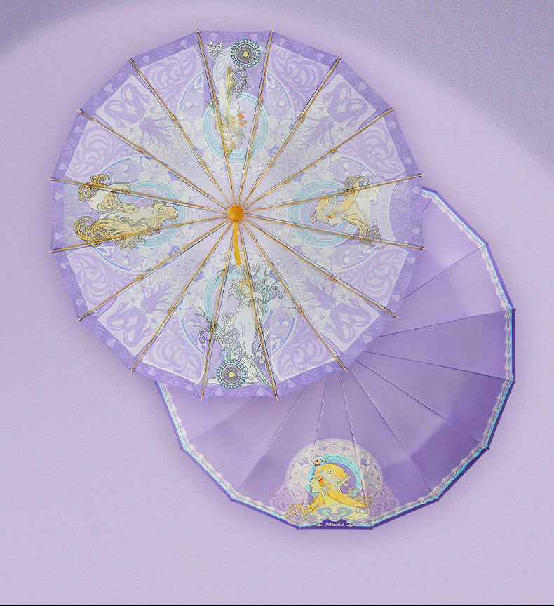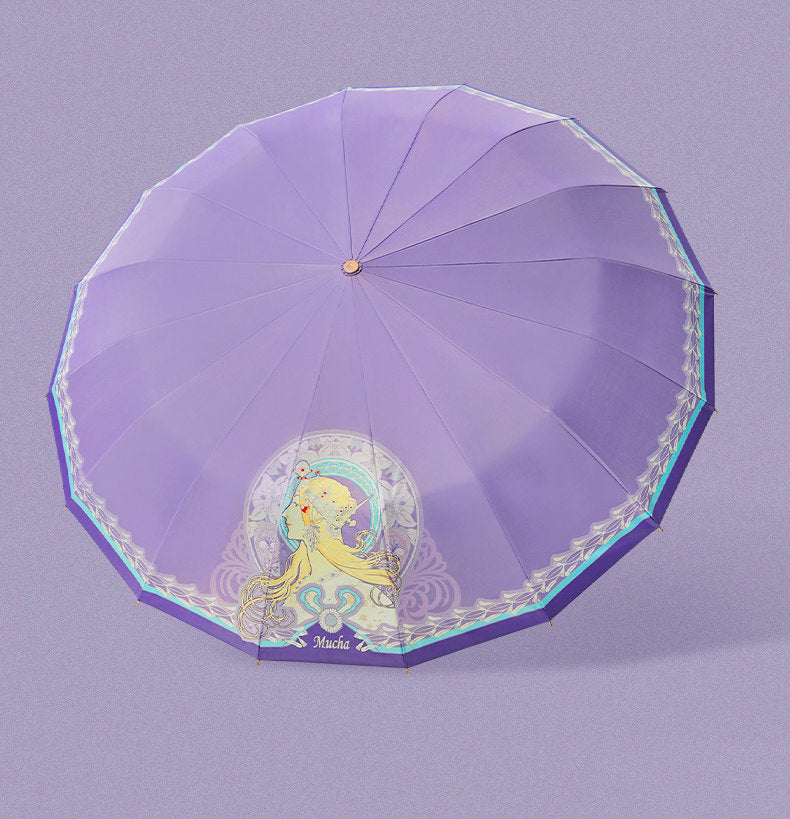 柔らかなパープルにミュシャを象徴するミューズがデザインされた、高貴でエレガントな折りたたみ傘