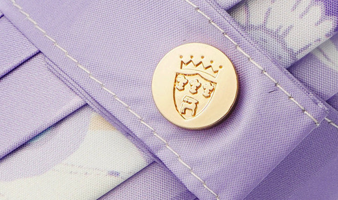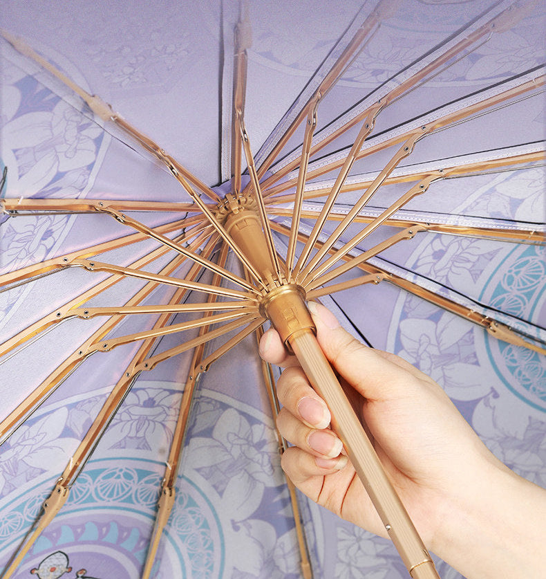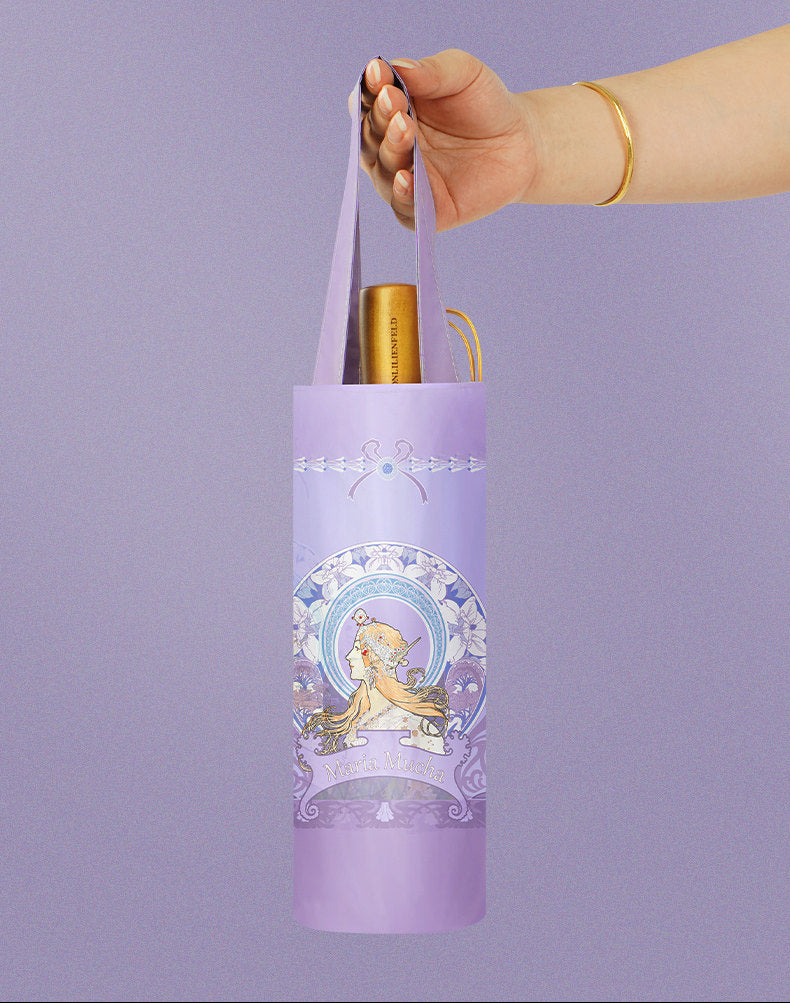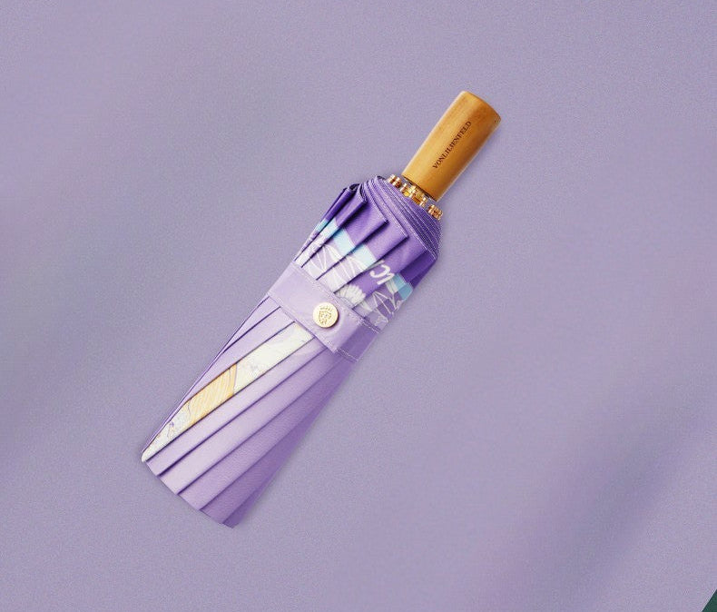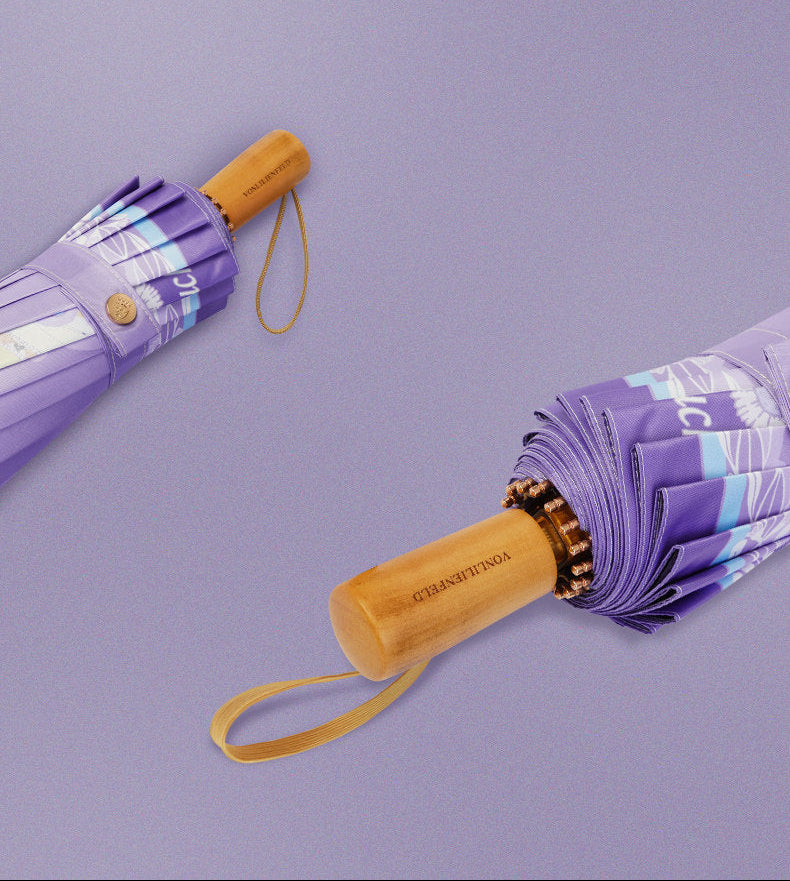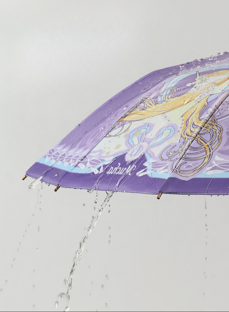 柔らかなパープルにミュシャを象徴するミューズがデザインされた、高貴でエレガントな折りたたみ傘