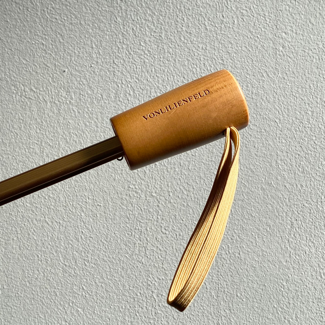 手元のハンドルは木製で温もりがあり握りやすく手に馴染みやすいです。また、ストラップもしっかりした作りになっています。